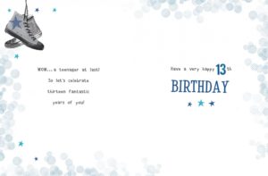 a colourful card for a boy’s 13th birthday, features a pair of converse trainers , 13 on splattered background, Happy 13th Birthday To You