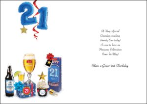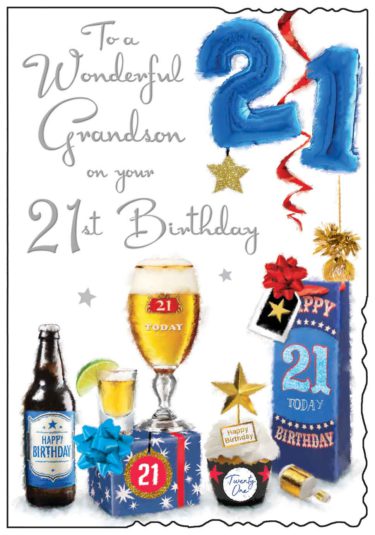 A Celebratory Grandson 21st Birthday Card, Design Assortment of Drinks, Presents & Cup cake