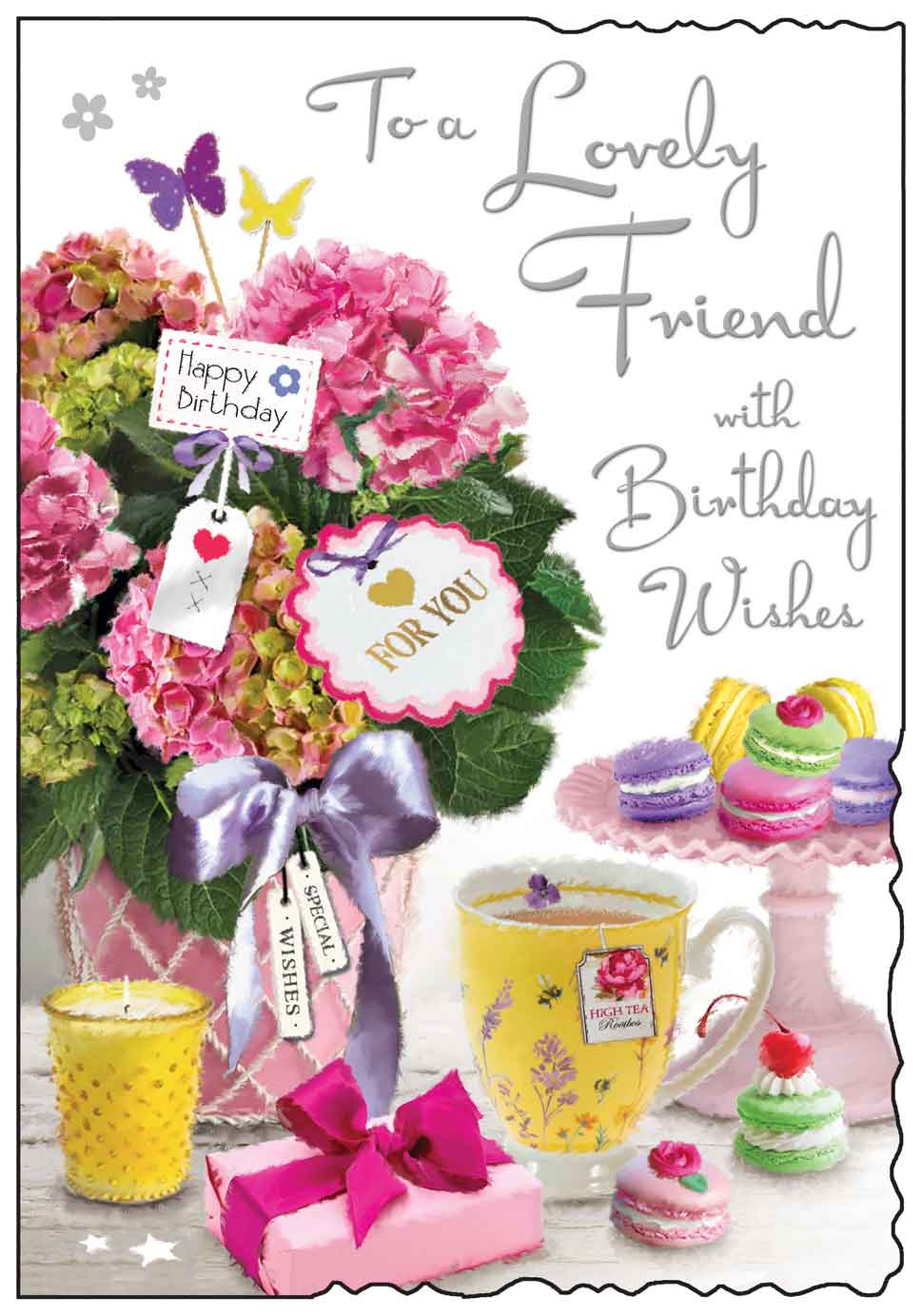 A Gorgeous Birthday card for a Lovely Friend, design Floral Bouquet Present, Candle ,Macaroon’s & Tea