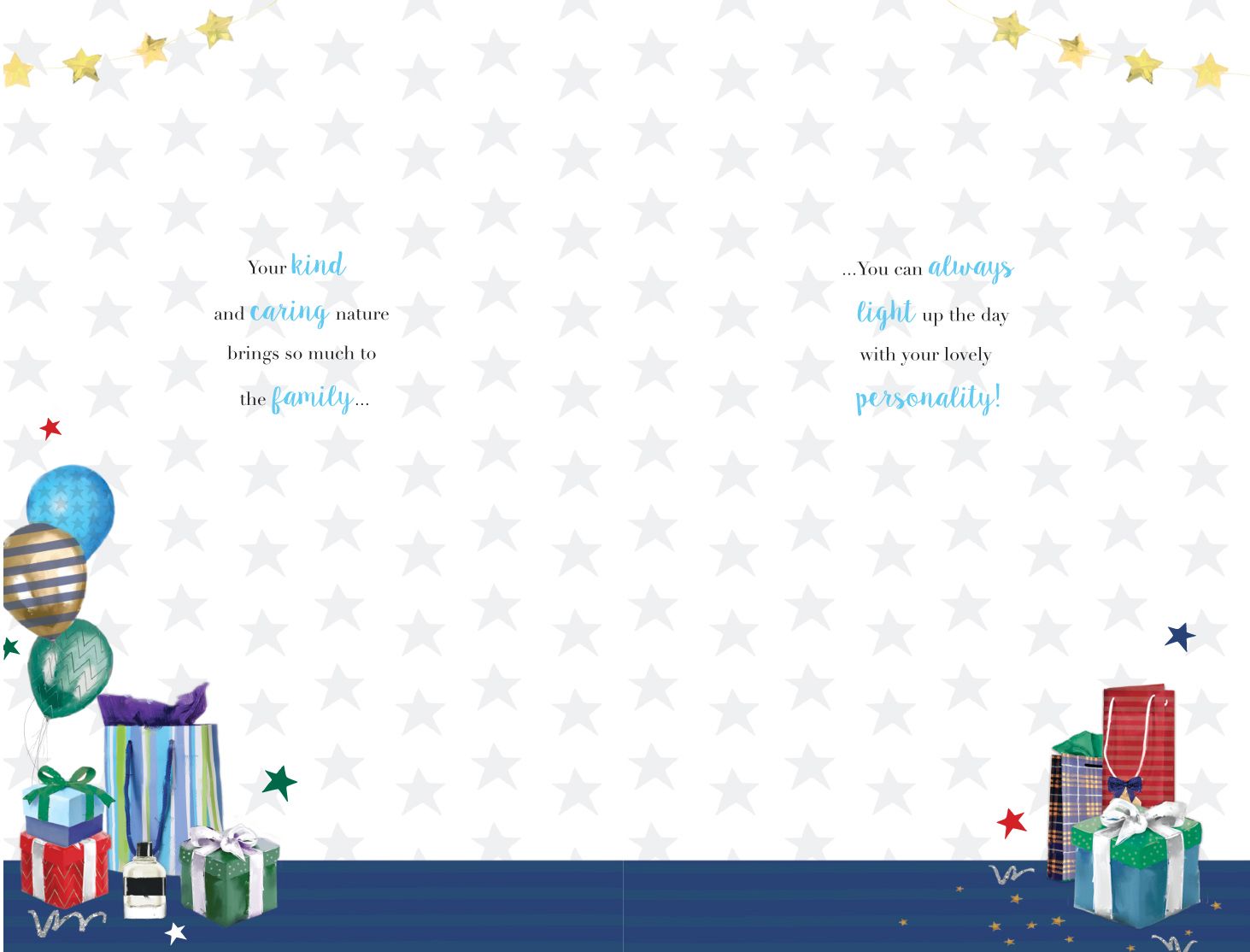 A very special Birthday card for your Son, features Gold foil text, with presents, balloons & birthday banner design, booklet style insert full colour with verse on each page