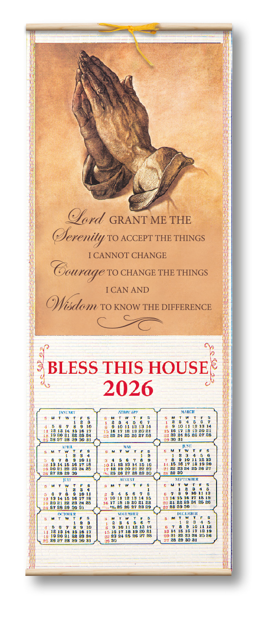 Serenity calendar An Image of the Praying Hands with the Serenity Prayer on a  30″ x 12″ decorative handcrafted hanging wood scroll  2026.
