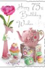 A beautiful celebratory  card to congratulate the special female on their 75th Birthday, design Floral stem, Cup cake, Present, Macaroons, & teapot.