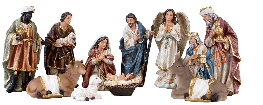 A beautiful Resin Nativity Set 6″. 11 resin figurines, hand painted with gold highlights.